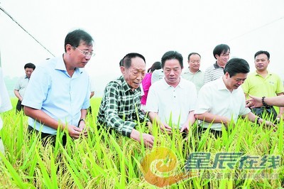 在袁隆平一行走过的田埂上,稻农们聚集在一起,想亲口向这位伟大的科学家问一声好,古铜色的脸上挂满丰收的笑容。袁隆平告诉记者,目前全国水稻平均亩产只有400公斤,超级杂交中稻“Y两优一号”在永定区创下大面积亩产600公斤左右的纪录,说明我省粮食增产还大有潜力。今年全省已在47个县市区的中低产田实施“种三产四”丰产工程,纳入计划的示范面积达450万亩。如果在全省现有的4000万亩中低产田中,拿出1500万亩通过“种三产四”实现预期增产目标,再加上高产田的带动,湖南就可以提前完成国家下达的“到2020年新增粮食30亿公斤”的目标任务。