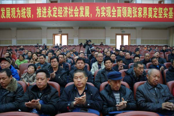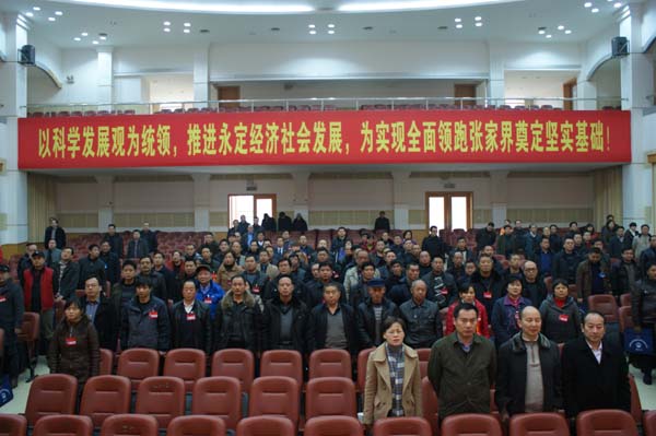 永定区人大常委会主任郑遐耀发讲话说,明年是永定区实施“十二五”规划的关键一年,是实现永定区全面建设小康社会的重要一年。蓝图已经绘就,目标已经确定,关键是要抓落实,让我们高举邓小平理论和三个代表重要思想的伟大旗帜,在大会精神指引下,同心同德,扎实工作,开拓进取,为促进物质文明、政治文明和精神文明协调发展的和谐永定而努力奋斗。