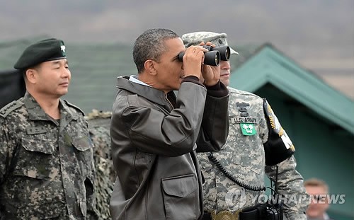 奥巴马在访问“三八线”地区时身着暗色风衣
