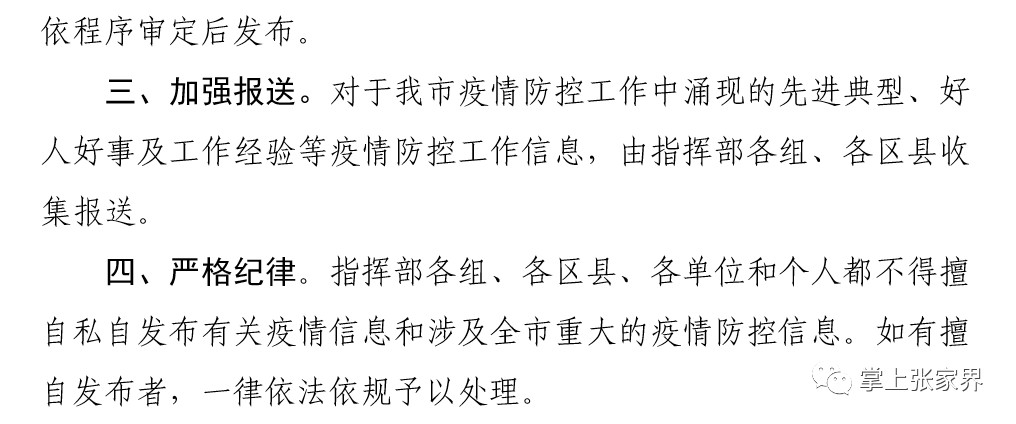 一、归口发布。关于新型冠状病毒感染的肺炎疫情信息发布统一归口省卫生健康委。我市指挥部依据省卫生健康委权威信息数据发布本地疫情总体情况和病例分布情况。疫情信息和涉及全市重大的疫情防控信息(指挥部令、通知、文件等),发布归口张家界市新型冠状病毒感染肺炎疫情防控工作指挥部,发布平台为张家界市对外新闻发布微信平台——掌上张家界,特殊情况由指挥部另外授权发布。严防多头发布、不当发布。