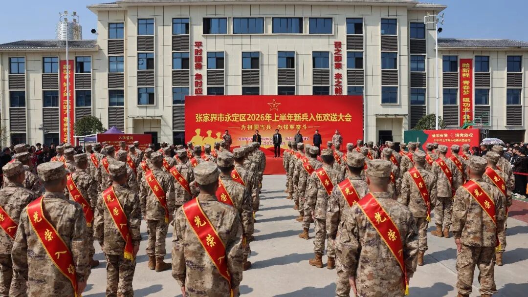 3月13日,永定区举行2026年上半年新兵入伍欢送大会,新兵们带着家乡亲人的祝福和期盼,踏上军旅征程。区委副书记、区人民政府区长王学军出席并讲话,区级领导欧湘云、屈春林、张帅、欧阳礼明、李伟参加欢送大会。